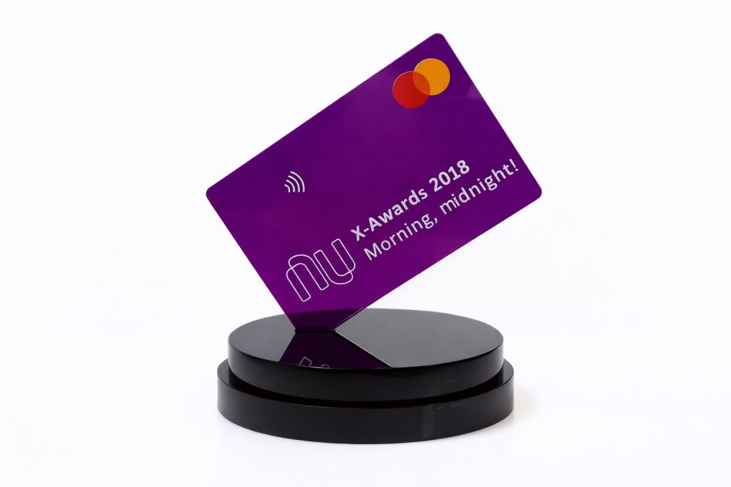 Acrílico espelhado com gravação personalizada de alto impacto visual.